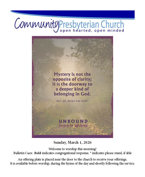 You are invited to worship with communion at CPC this Sunday – onsite or online at 9:30 am. The link for online worship is below. If you are participating online, please have a cracker or some bread and some juice available. The bulletin can be found by clicking here or by clicking on the picture of the bulletin! We welcome guest preacher, Rev. Julie Beck, for this Lenten season!