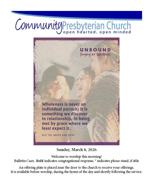 You are invited to worship with communion at CPC this Sunday – onsite or online at 9:30 am. The link for online worship is below. If you are participating online, please have a cracker or some bread and some juice available. The bulletin can be found by clicking here or by clicking on the picture of the bulletin! We welcome guest preacher, Rev. Julie Beck, for this Lenten season!